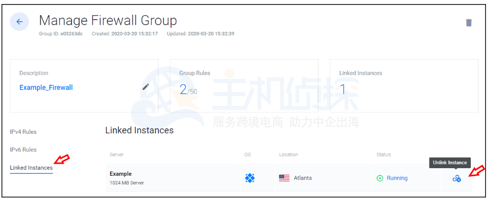 然后查看和取消链接实例,单击“ 链接的实例”以查看链接的服务器,再单击取消链接实例图标,以从防火墙组中删除服务器。