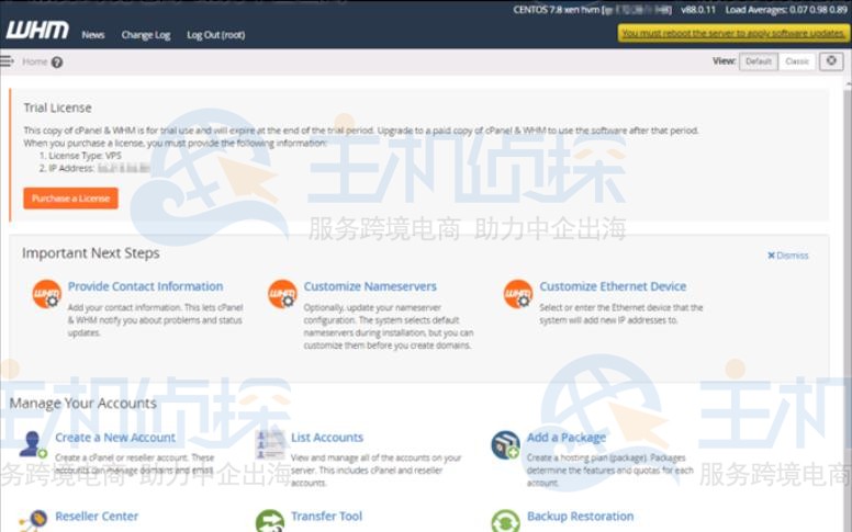 注意:如果选择保存设置并为 WHM 启用新功能,可能需要重新启动实例,使这些更新生效。要重新启动实例,然后选择 WHM 控制台顶部导航栏中的必须重启服务器以应用软件更新链接,然后按照提示进行重启。