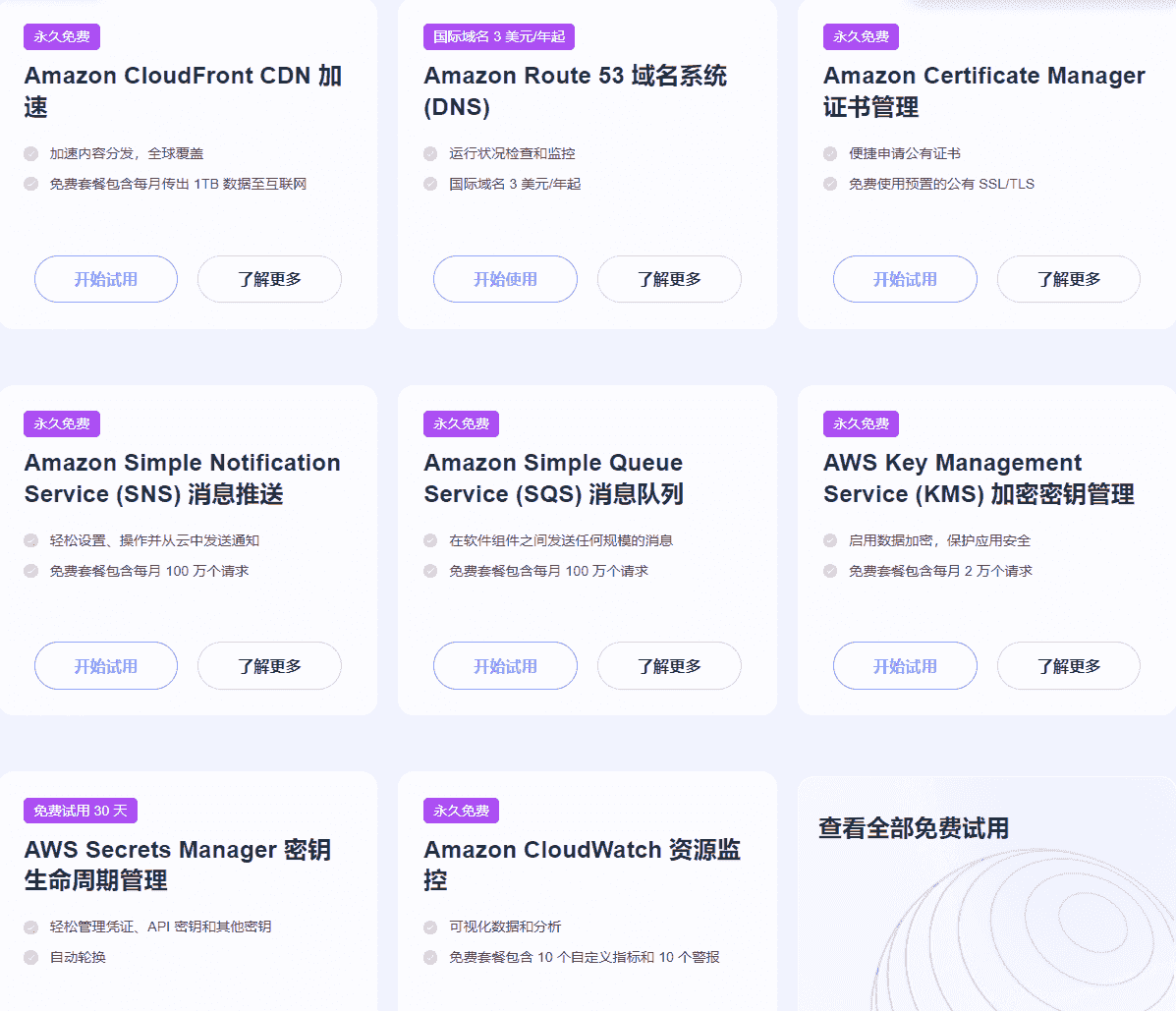 亚马逊云科技还提供其他热门服务免费试用,Amazon CloudFont加速全球内容分发,Amazon Route 53提供低价域名服务,Amazon Certificate Manager免费管理SSL/TLS证书,Amazon SNS和SQS支持消息推送与队列,Amazon KMS保护数据安全,Amazon CloudWatch监控资源。