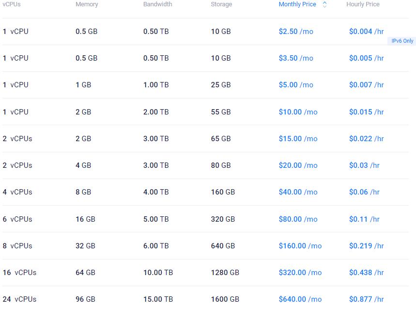 | 内存 | CPU | 硬盘 | 流量/带宽 | 价格/小时 | 价格/月 |