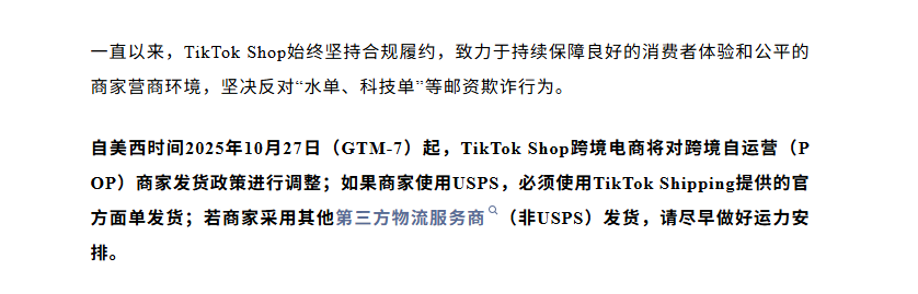 《TikTok Shop发货规则迎来重要变更:10月27日起将限制商家使用USPS自发货》