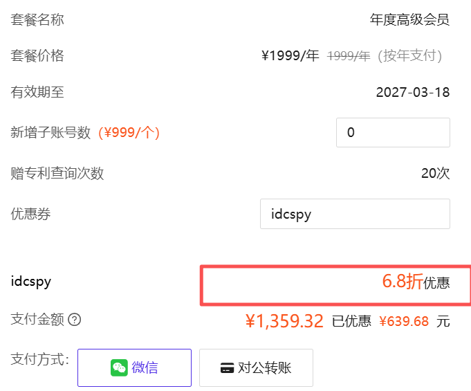 - 月度高级会员6.8折,1个主账号,原价399元/月,优惠价271元/月