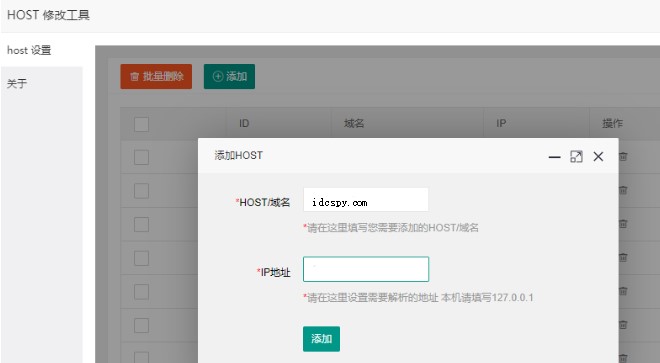 打开已经安装的“HOST修改工具”插件,填写域名(例如:idcspy.com)和源站点的IP地址。或者直接在目录/etc/hosts下修改HOST文件,这样就不用安装插件。