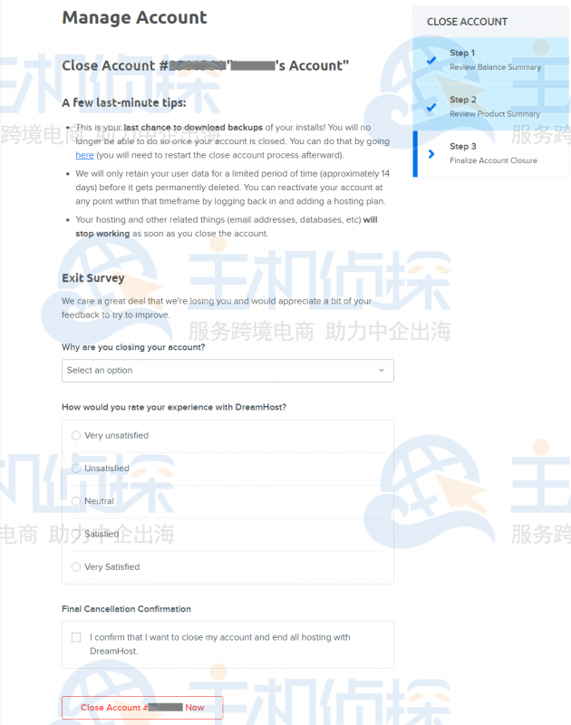第四步,DreamHost有一个相关调查,可以选择你关闭账号的原因以及对DreamHost产品的满意度,勾选Final Cancellation Confirmation,点击Close Account xxx Now。