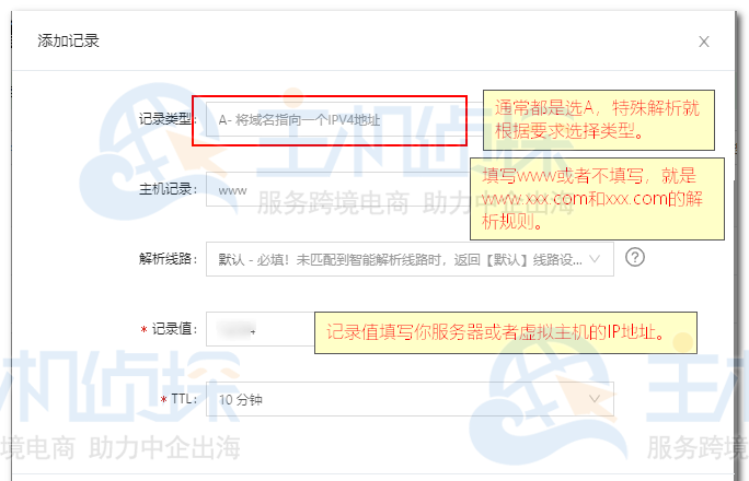 记录类型通常都是填写A记录,某些特殊情况会用CNAME或者其他类型,自己根据需要选择类型就可以了。