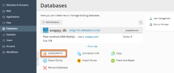 3、从数据库名称下的选项列表中单击phpMyAdmin图标,进入phpMyAdmin管理页面,您可进行创建数据库、导入数据库等相关操作。