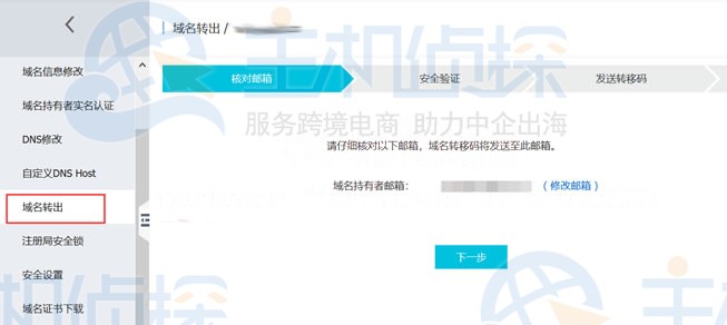 我们在左边菜单找到”域名转出”,然后根据向导验证信息,然后获取到转移码。之后我们拿着转移码和域名,就可以转出到任何的域名注册商中。具体域名传入可以参考相关教程。