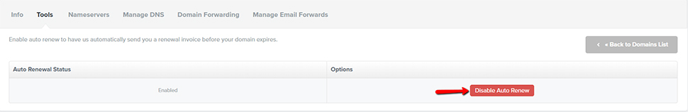 您将看到禁用或启用域名自动续订的选项,具体取决于当前状态:
