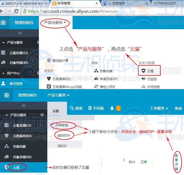 3.点击“产品与服务”,接着在下拉框中点击“云盾”。点击完后左侧就有了云盾功能,此时接着点击“网络安全”,再点击“基础防护”,点击右侧的“查看详情”。配图:点击产品与服务调出云盾功能
