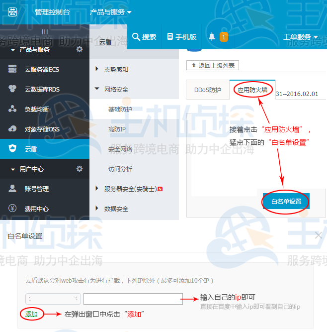4.现在还看不到白名单设置,主要是因为还有几步。接着点击“应用防火墙”,此时已经看到“白名单设置”了,直接点击吧。然后会弹出一个窗口,先点击“添加”,然后在新文本框中输入自己的ip地址即可。配图:应用防火墙中添加白名单如果看官不知道ip的话,直接打开百度,然后输入ip即可看到自己的ip地址。配图:在百度中输入ip可查看自己的ip地址即可。