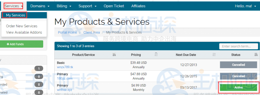 HawkHost虚拟主机开通后登录你的账号,点击“Services”中的“My Services”查看自己的服务列表,然后点击自己要管理的主机进入到管理页面。