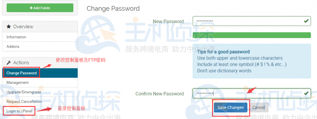 修改控制面板及FTP密码。如果要登录控制面板点击“Login to Cpanel”。也可以使用你邮箱收到的控制面板地址进行登录http://你的主机IP/cpanel登录控制面板。
