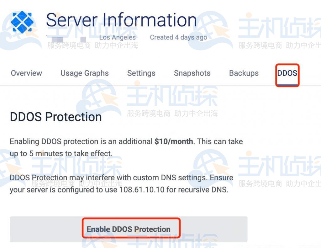 登录Vultr官网,在需要开启DDoS防御功能的Vultr VPS中选择“DDOS”标签,之后点击“Enable DDOS Protection”即可为这台Vultr VPS开启DDoS防御:
