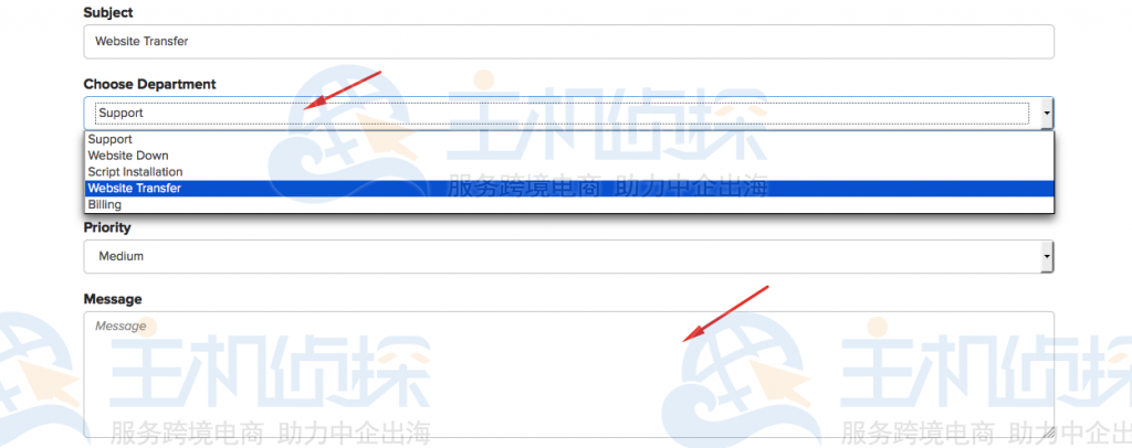 这将引导您进入支持票部分。填写您的工单主题并从下拉菜单中选择网站传输部门。