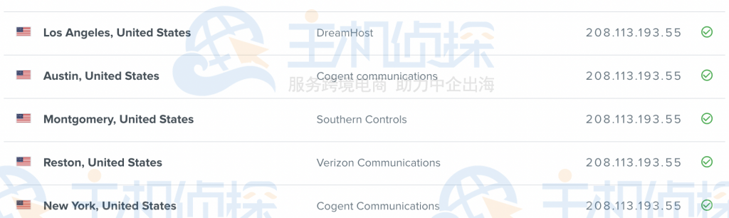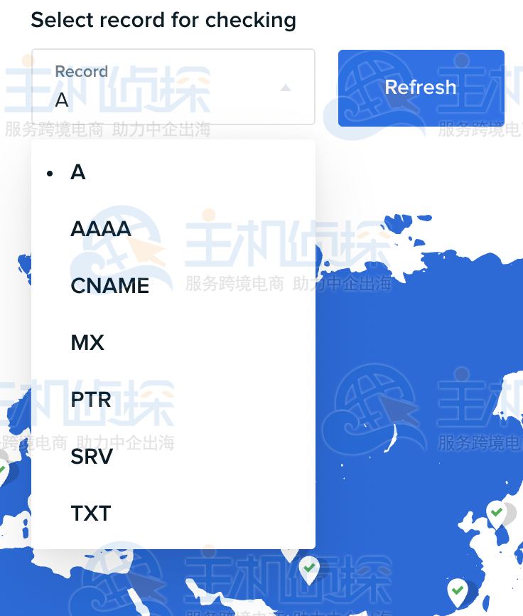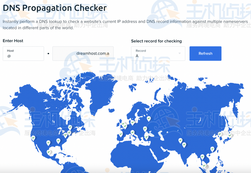 DNS 传播检查器页面允许您立即执行 DNS 查找,以针对位于世界不同地区的多个名称服务器检查您网站的当前 IP 地址和 DNS 记录信息:
