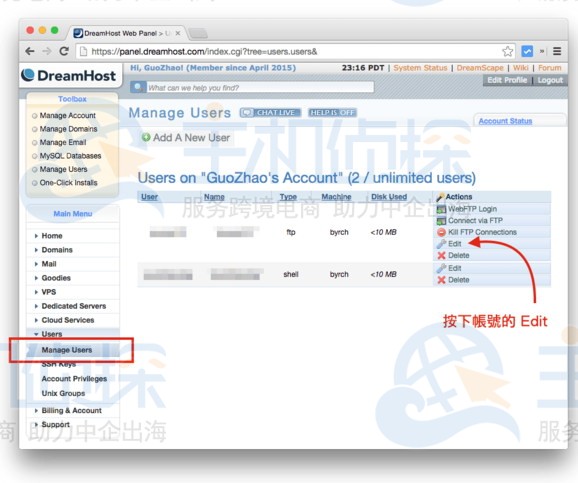 第五步:如果您的 FTP 账号的密码还没设定,请在「Manage Users」页面中,点选对应账号的「Edit」。