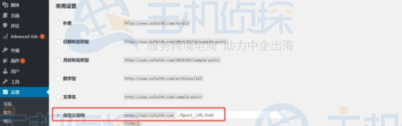 选择【常用设置】 下的 【自定义结构】 , 可选择单个标签或多个标签组合, 可自定义拼接字符串, 本站点使用的是 /%post_id%.html, 填写完毕后, 点击 【保存更改】即可生效.