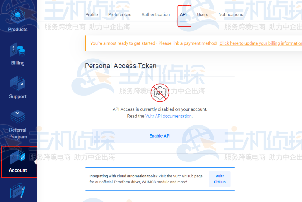 进入Vultr官网(点击前往)后台之后,可以点击左侧菜单的 Account,然后点击 API,如下图所示,就可以看到 Enable API 按钮了,就可以开启 API 功能了。
