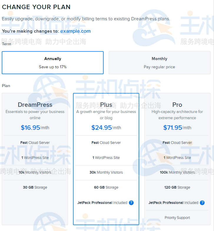 选择年度或月度期限,选择 DreamPress 计划(DreamPress Basic、Plus 或 Pro)