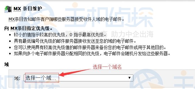 2、在进入MX条目维护,在下方的域中选择需要设置的域名;