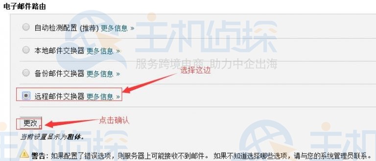 3、在“电子邮件路由”中选择远程邮件交换器,并点击更改;