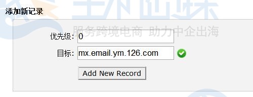 4、因为优先权数值越低,权限则越高,所以,在下面的权限及地址设置中,要设置最高权限0,在填写上邮箱的MX记录,最后点击“Add New Record”就可以了;