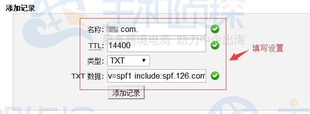 6、在增加记录中,进行填写TXT记录可以写为v=spf1 include:spf.163.com ~all格式。