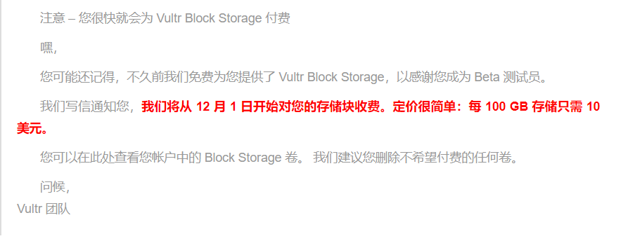 Vultr Block Storage块存储了解的人都知道10G需要收费1美元,但是仍有很多人不知道,就会收到下面这样的邮件,如果你需要用,那当然就是要收费了,那要是用不到,就可以去删除,本文就来说说Vultr Block Storage块存储删除教程,一起来看看吧!