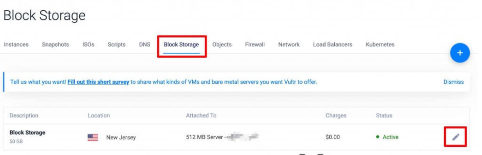 如果需要删除 Vultr 块存储,很简单,登录到 Vultr 后台,点击 Block Storage,如图所示。然后点击 Manage 按钮,也就是图中那个笔。
