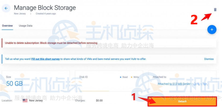 在 Vultr Block Storage 页面,首先点击 Detach 将块存储取消挂载,然后点击右上角的删除按钮即可删除块存储。