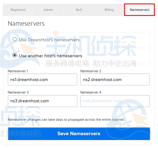 3.在下一页上,单击名称服务器选项卡并选择“使用另一台主机的名称服务器”选项将您的名称服务器更改为另一台主机(或者,您可以通过单击“使用 DreamHost 的名称服务器”单选按钮自动设置 DreamHost 的名称服务器)。