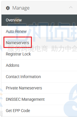 第四步:单击绿色的“活动”按钮后,您将被重定向到您的域管理页面。在该页面上有一个名为“管理”的左侧菜单 。在其下方是一个名为“Nameservers”的选项 。单击菜单中的 “名称服务器” 链接;