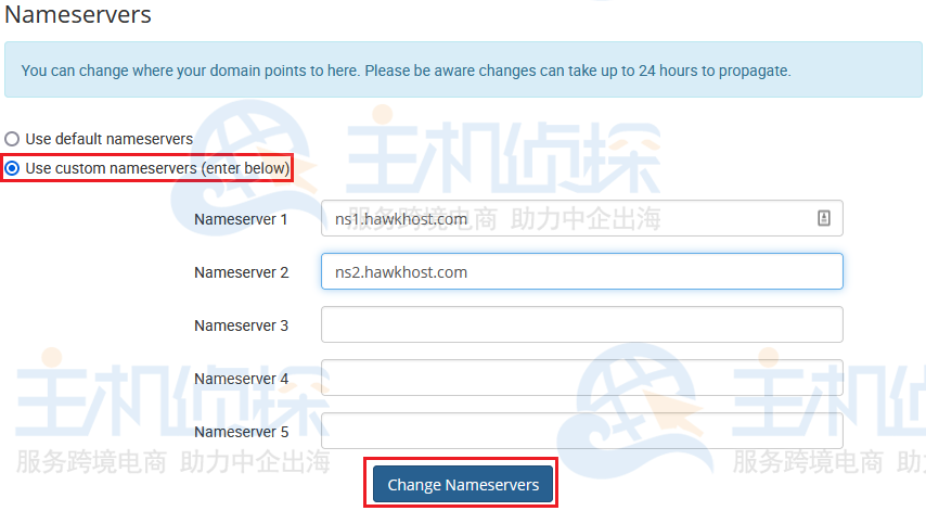 第五步:选择标题为“使用自定义名称服务器(在下面输入)”的选项。在相关字段中输入所需的名称服务器。输入新的自定义名称服务器后,单击“更改名称 服务器” 以完成更改;