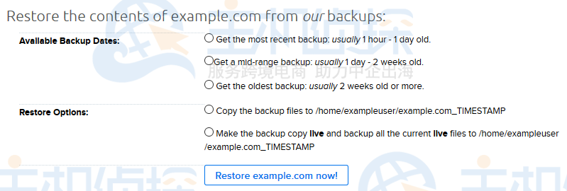 第二个选项采用现有备份并立即使其成为您的实时网站。然后将当前站点上的文件移动到以您的站点命名的目录中,后跟时间戳。如果您希望您的网站立即恢复到旧版本,请使用此选项。