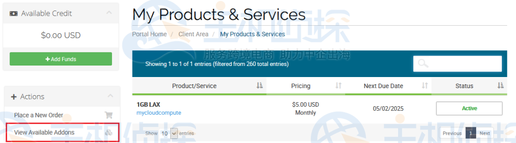 3、在您的“我的产品和服务”页面的左中侧有一个“操作”菜单。点击“查看可用插件”: