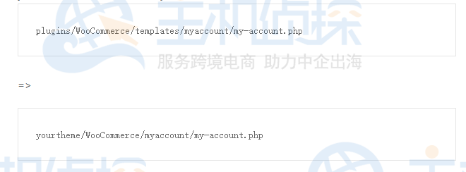 把 plugins/WooCommerce/templates/myaccount/my-account.php 文件拷贝到 yourtheme/WooCommerce/myaccount/目录下,对应关系如下