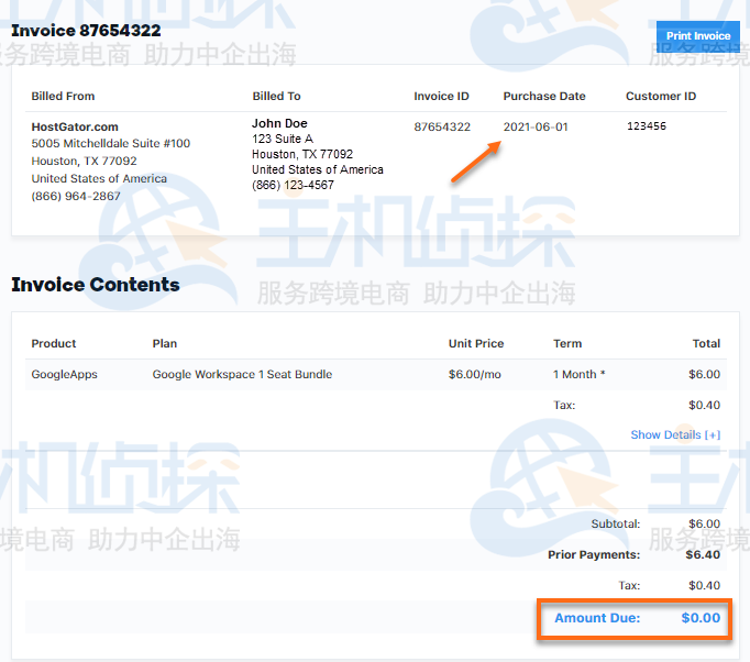 下面的示例发票适用于附加产品(Constant Contact)。产品描述可能看起来不同;但是,此处显示的详细信息类似于域、托管计划和其他 HostGator 服务的发票。