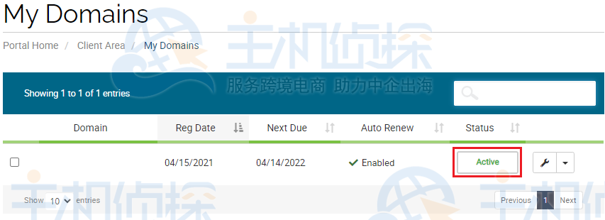 4、单击您正在修改的域右侧的绿色“活动”按钮/链接:
