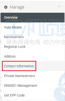 5、单击绿色的“活动”按钮后,您将进入域管理页面。从左侧的“管理”菜单中选择“联系信息”链接: