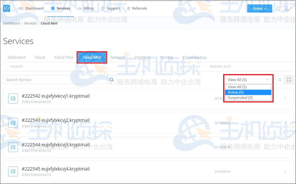 Krypt服务器还有一个名字叫美国KT机房服务器,原因是中国大陆地区访问速度最快的美国服务器之一,之前小编也陆陆续续介绍过不少Krypt相关教程,本文来介绍一下Krypt服务器如何查看云邮件?要查看服务选项卡下的云邮件服务列表,请单击云 邮件以查看您的活动或暂停服务的列表。