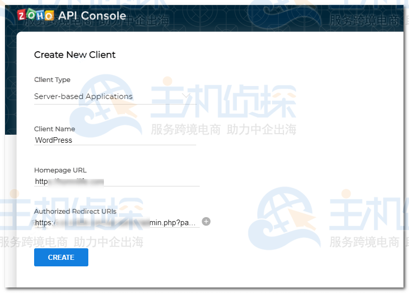 5、填写网站网址和跳转url(从WP后台插件复制过去),然后点击CREATE。