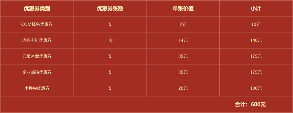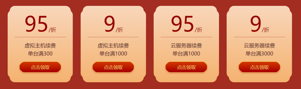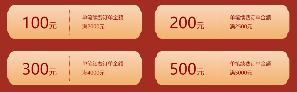 活动期间所有级别用户可免费领取以下续费优惠券,不限领取次数。 (单台主机订单满足相应条件时,使用优惠券结算可享受对应折扣。)完成续费还可获赠抽奖机会,奖品为微信现金红包(最高可得999元),百分百中奖。