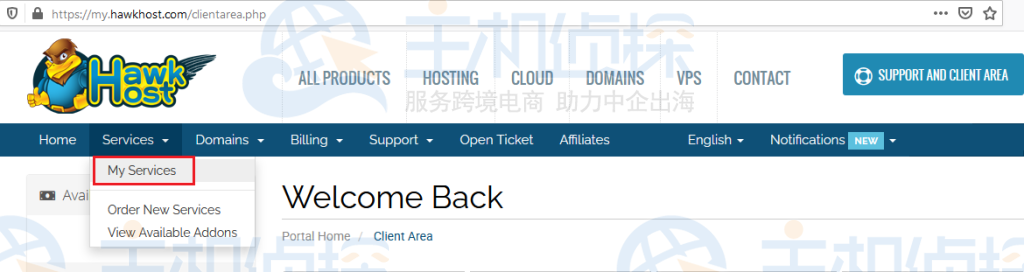 1、在https://my.hawkhost.com/clientarea.php登录HawkHost官网客户区。