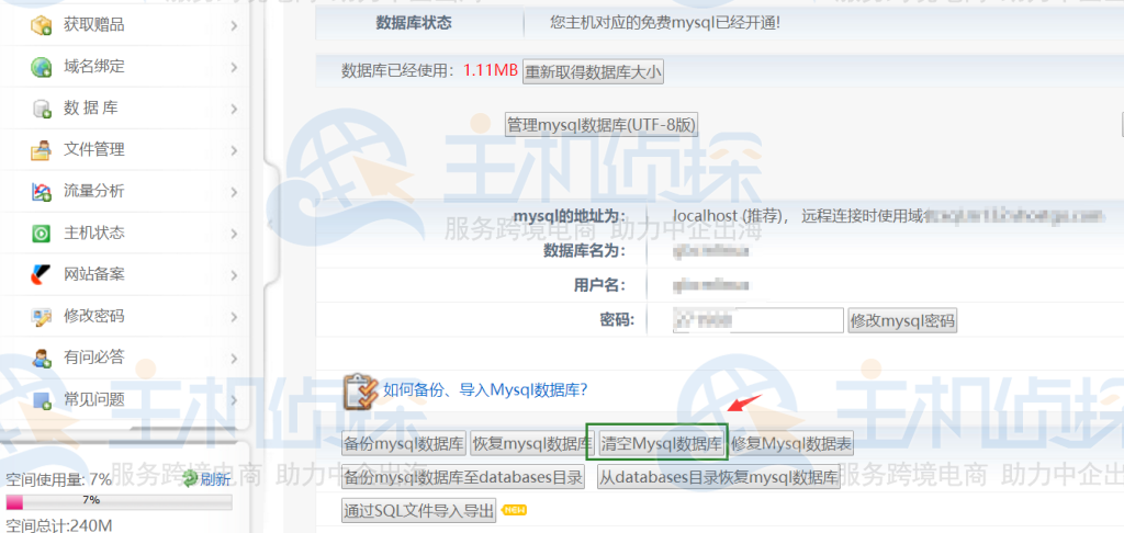 如果是单独购买的数据库,直接点击“业务管理”—“虚拟主机管理”—选择您购买的数据库,点击右侧“管理”,进入数据库管理界面,点击下方的清空数据库,即可清空目前数据库中的所有内容,与赠送的数据库清理方法一致。