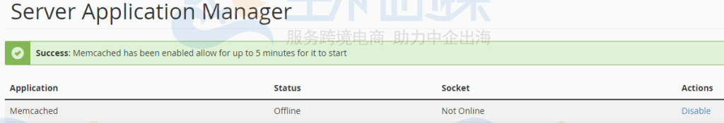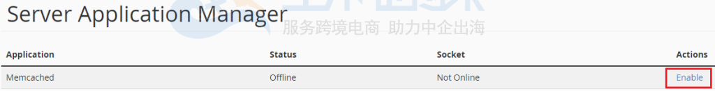 4、在“服务器应用程序管理器”配置页面上,您将看到列出的一些选项,包括memcached。在memcached 行旁边,单击“操作”菜单下的“启用”: