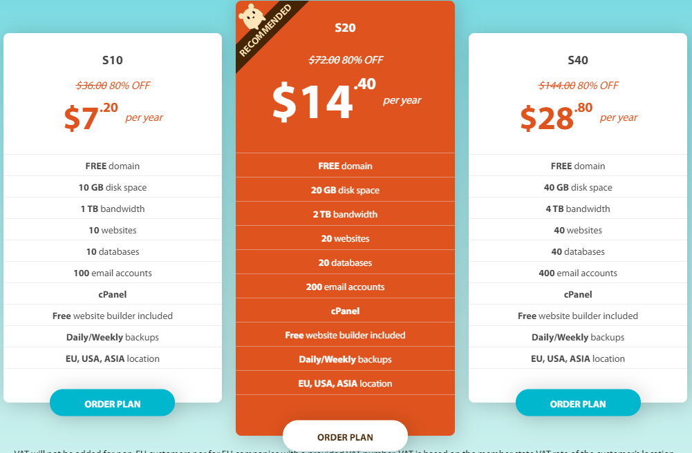 Hostens虚拟主机目前有S10、S20、S40三款套餐,磁盘空间从10GB、20GB、40GB不等,提供每日/每周备份服务,购买时长越长,优惠越大。选择年付第一年可免费获得.SITE/.WEBSITE/.TECH/.STORE/.ONLINE域名。