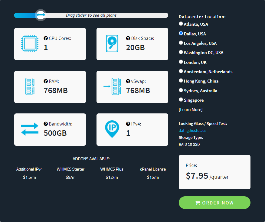 方案配置只需滑动图标选择即可。OpenVZ VPS 以非常实惠的价格提供具有半专用资源和完全根访问权限的容器化 Linux 系统。可在全球 10 个地点使用。