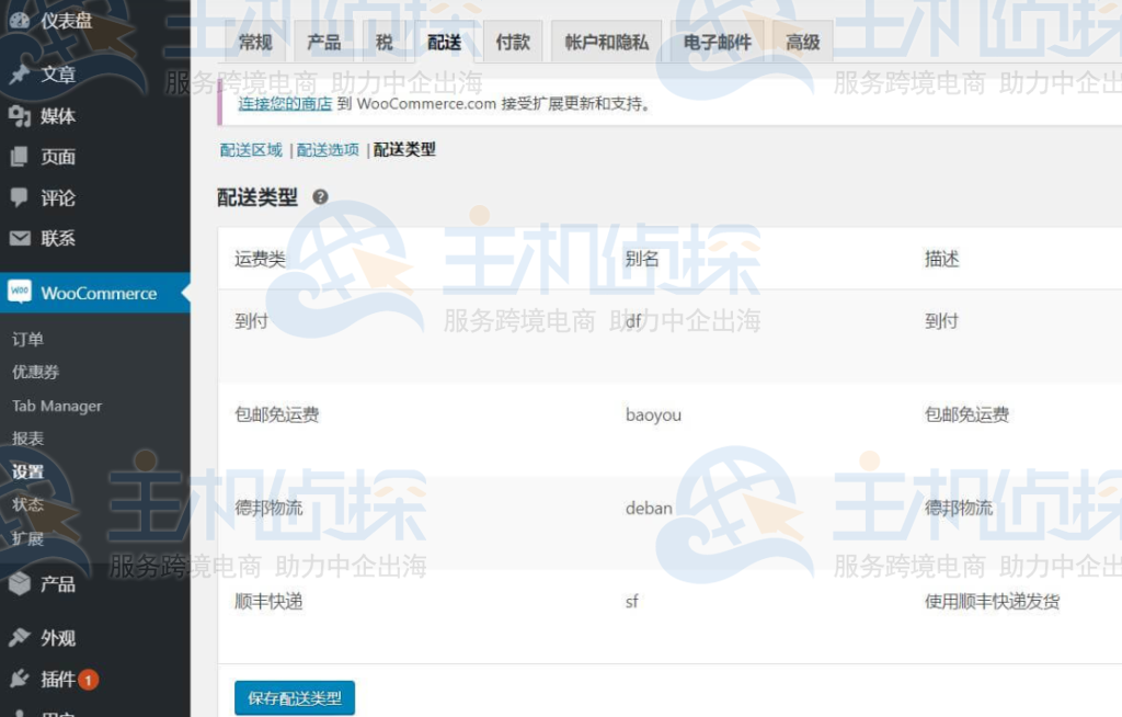进入WordPress后台–WooCommerce—设置,切换到配送,选择配送类型。