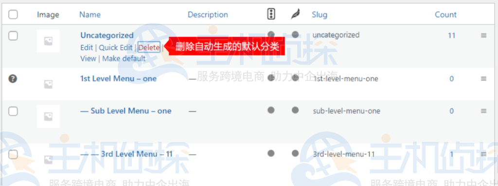 点击其中的Delete(删除)设置项,将WooCommerce自动生成的Uncategorized(未分类)删除掉了。