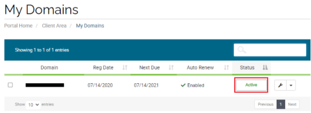 在“我的域名”页面中,选择您正在修改的域名右侧的绿色“活动”按钮:
